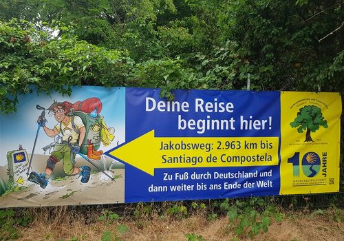 Pünktlich zu Beginn der Sommerferien wurde unser Jakobsweg-Banner an der Gartenarbeitsschule Tempelhof-Schöneberg ausgetauscht. Das bisherige Banner war leider Vandalismus zum Opfer gefallen. Mit Pilger-Karikatur wünschen wir allen Pilgerinnen und Pilgern einen guten Weg.