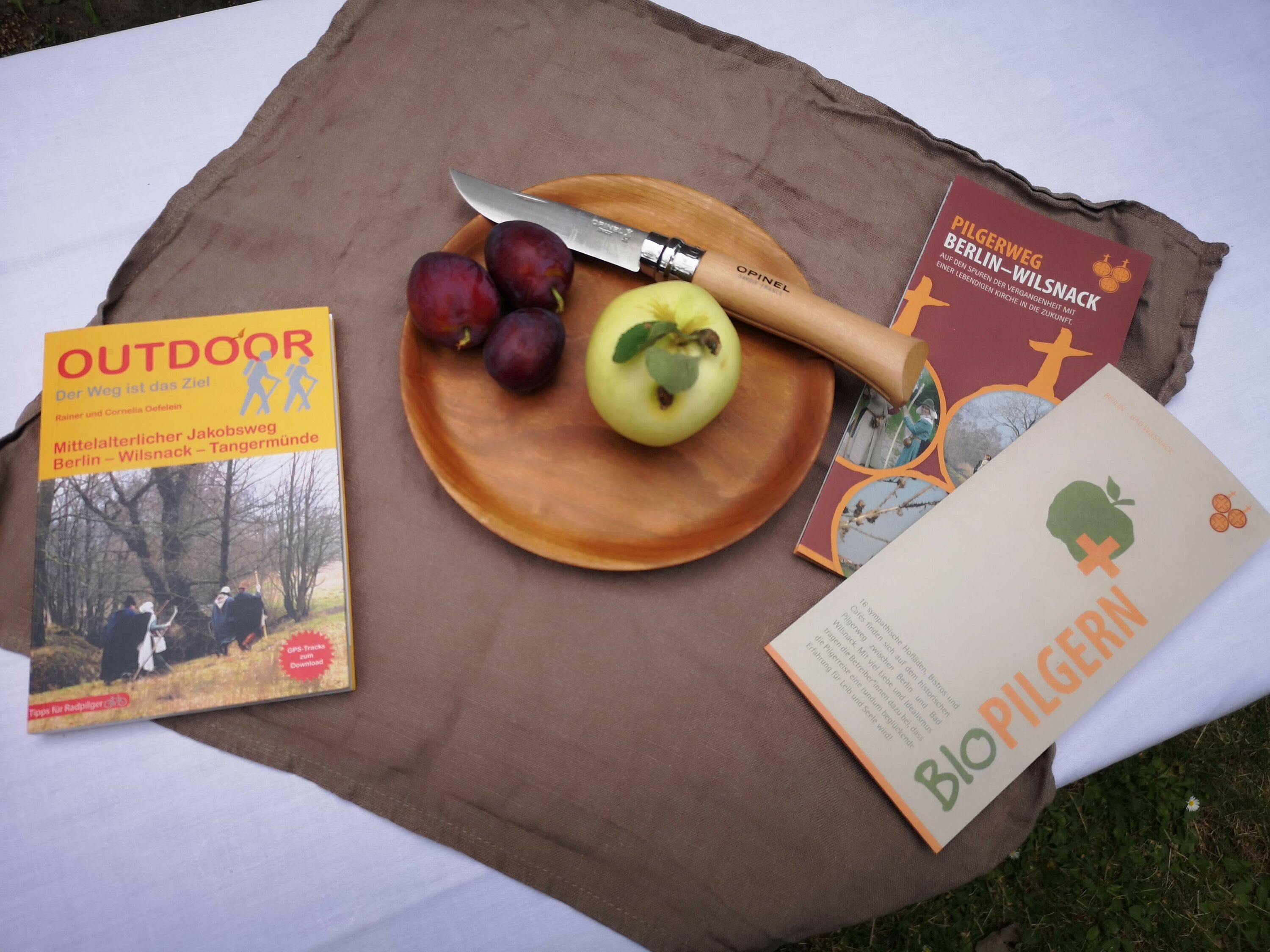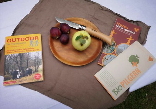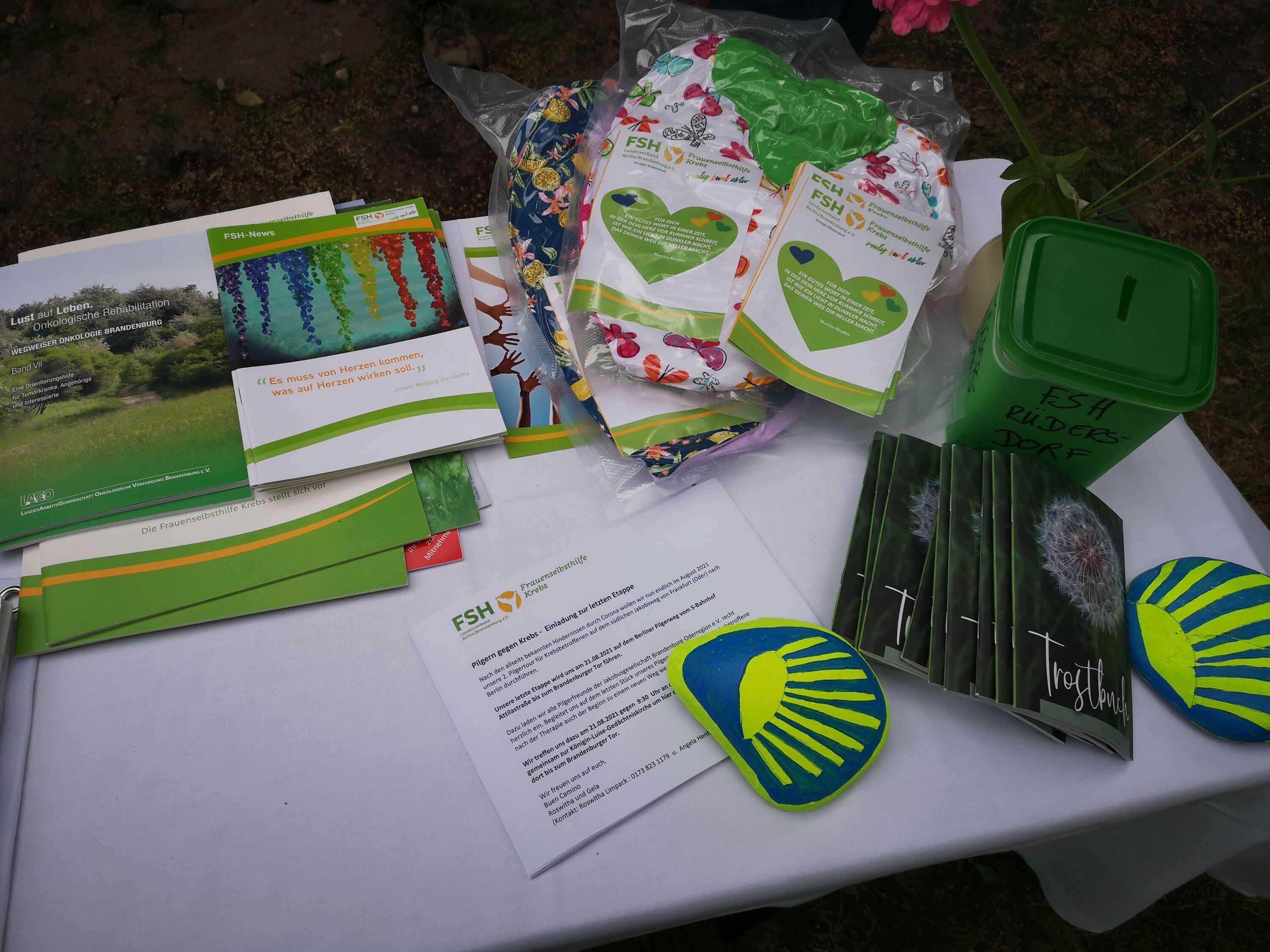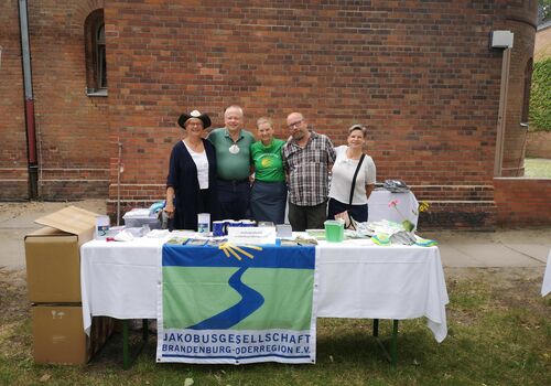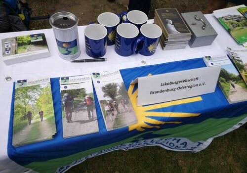 Im Anschluss gab es Unmengen an Informationen im Kirchgarten von vielen Organisationen, die sich dem Pilgern verschrieben haben, darunter unsere Schwestergesellschaft St. Jakobus-Gesellschaft Berlin-Brandenburg, der Förderverein Wunderblutkirche Bad Wilsnack mit dem zugehörigen Projekt "biopilgern", die Frauenselbsthilfegruppe Krebs mit "Pilgern gegen Krebs", der Kirchenkreis Spandau mit den "Spandauer Pilgerwegen", die Ökumenische Pilgerinitiative Stralsund und, und, und.