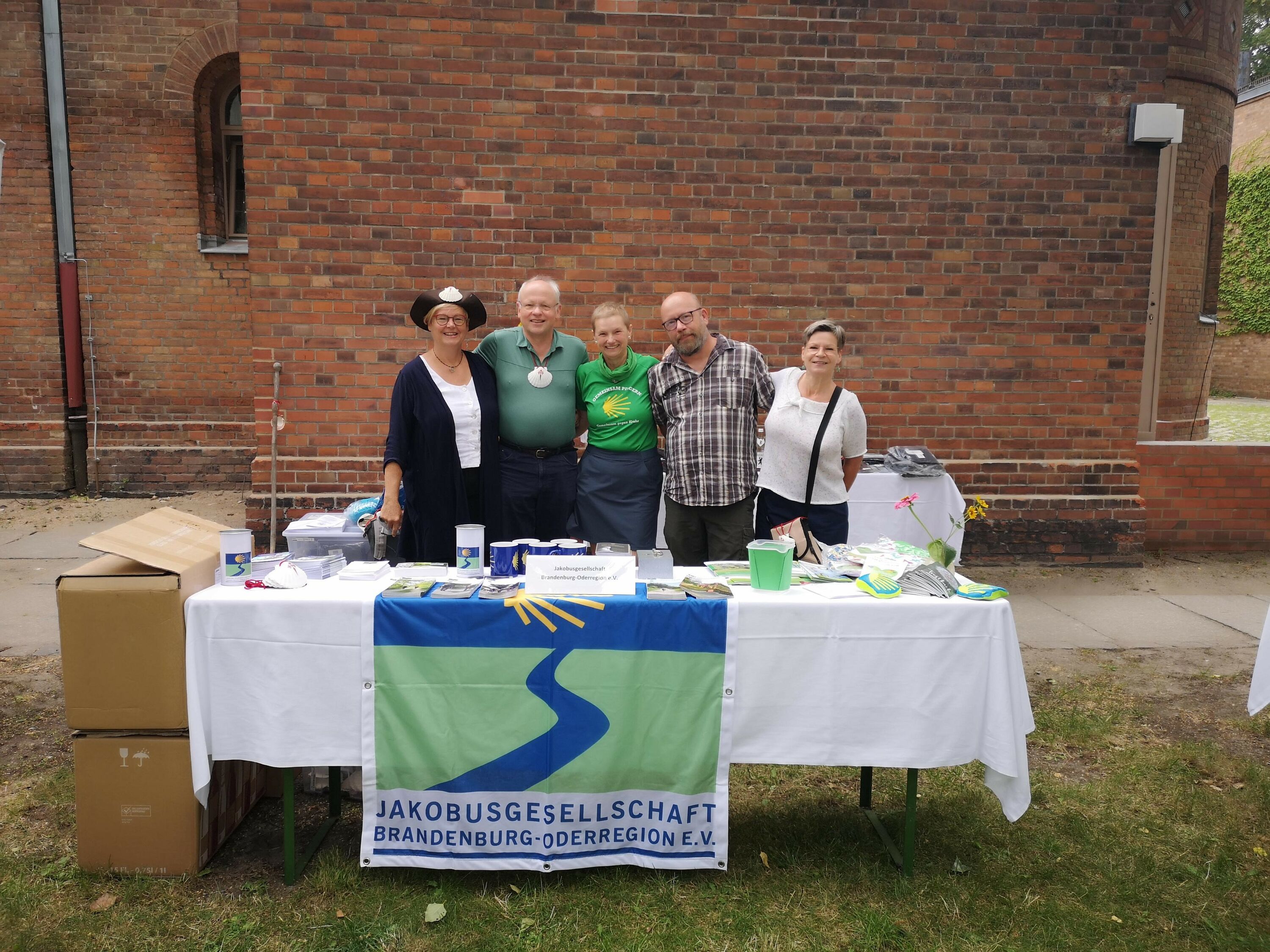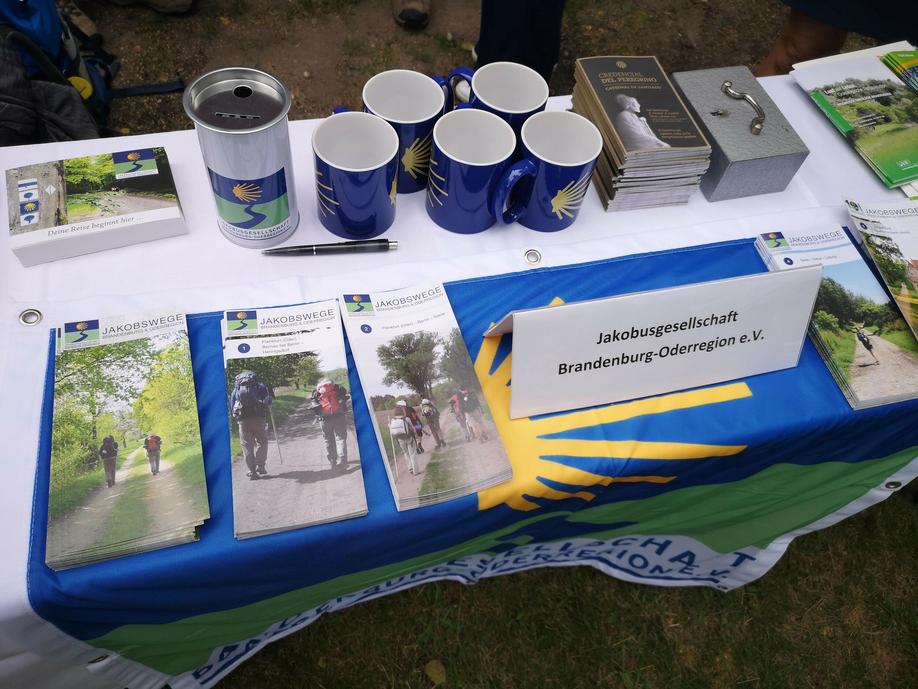 Im Anschluss gab es Unmengen an Informationen im Kirchgarten von vielen Organisationen, die sich dem Pilgern verschrieben haben, darunter unsere Schwestergesellschaft St. Jakobus-Gesellschaft Berlin-Brandenburg, der Förderverein Wunderblutkirche Bad Wilsnack mit dem zugehörigen Projekt "biopilgern", die Frauenselbsthilfegruppe Krebs mit "Pilgern gegen Krebs", der Kirchenkreis Spandau mit den "Spandauer Pilgerwegen", die Ökumenische Pilgerinitiative Stralsund und, und, und.