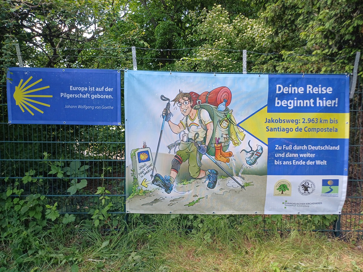 „Europa ist auf der Pilgerschaft geboren“, dieses neue Spruchbanner ist ab sofort an der Gartenarbeitsschule Tempelhof-Schöneberg zu bestaunen. Die Jakobsweg-Ausschilderung wurde an dieser Stelle in den vergangenen Jahren mehrfach durch Vandalismus beschädigt und zerstört. Mit Unterstützung von Gartenarbeitsschule, Bezirksamt und dem evangelischen Kirchenkreis Tempelhof-Schöneberg werden hier zukünftig jährlich wechselnd verschiedene Pilgerweisheiten zu sehen sein.