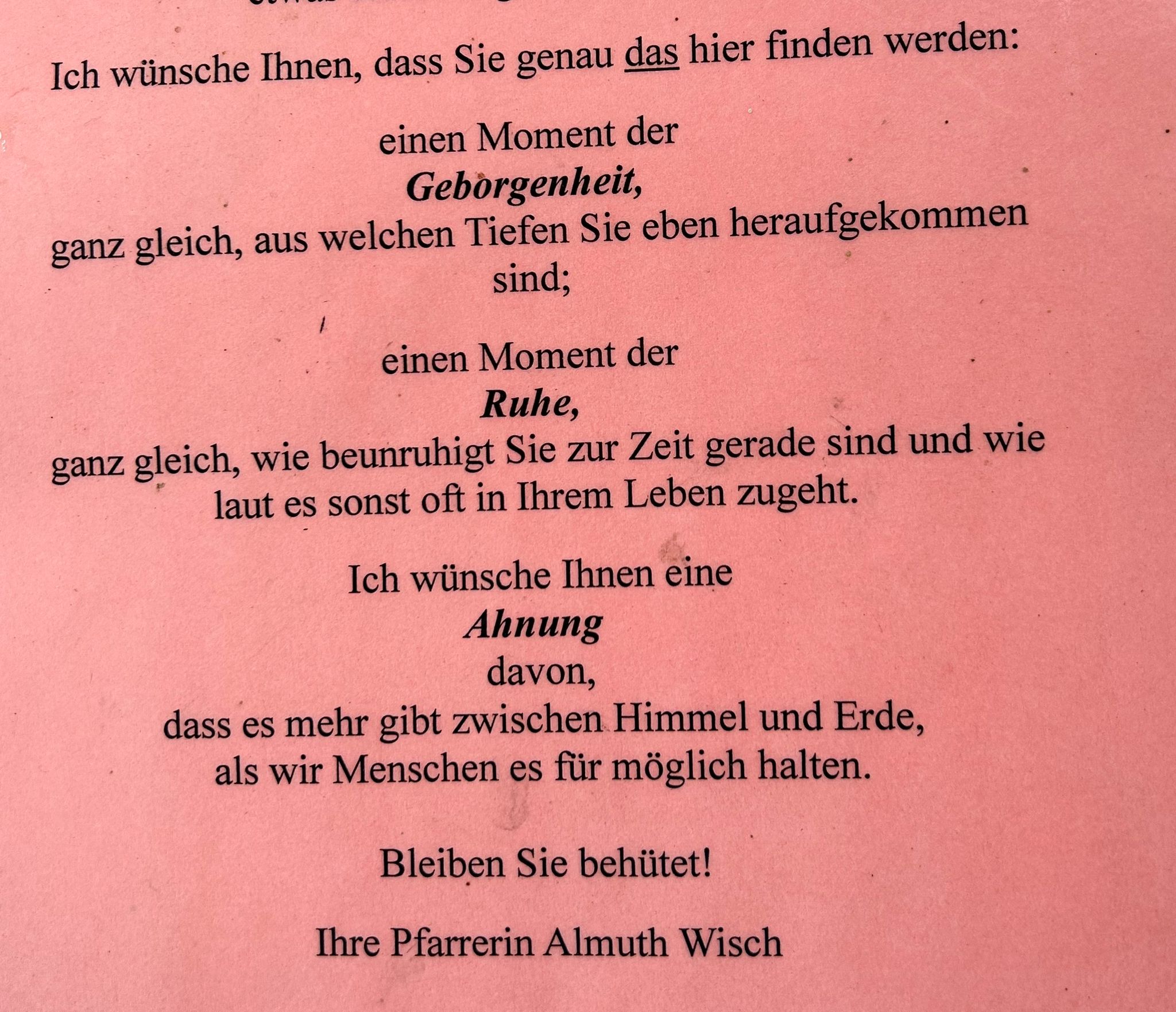 Für mich war es trotz des widrigen Wetters ein wunderschöner Pilgertag. Die innere Einkehr beim Gehen und Wandern, die angenehmen Gespräche mit den Anderen, dabei neue Menschen kennenzulernen, all das sind Dinge, die ich am Pilgern so sehr zu schätzen gelernt habe. Ich freue mich schon auf das nächste Samstagspilgern.