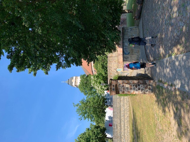 Freitag Nachmittag war Treff in Frankfurt/Oder-Rosengarten, von wo wir nach Pillgram pilgerten. Waren wir uns alle wirklich bewusst, auf ganz alten Handelsstraßen und Pilgerwegen unterwegs gewesen zu sein? Pillgram blickt auf eine bewegende Geschichte zurück, da diesen Ort schon vor Jahrhunderten Pilger querten mit vollster Entbehrung und mit dem Ziel vor Augen, Santiago de Compostela zu erreichen.