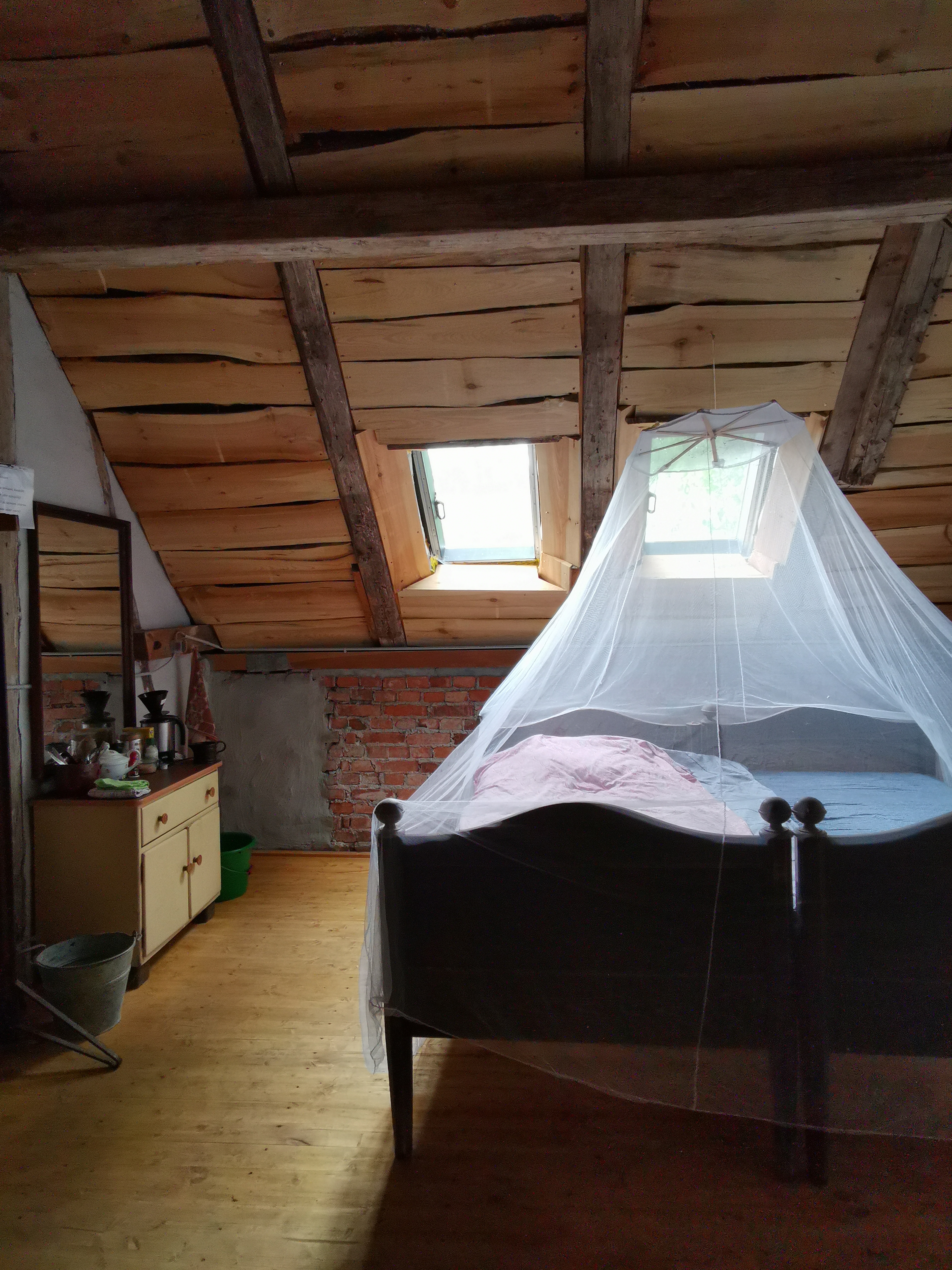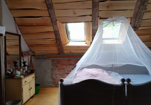 In Stolpe auf dem Stolper Turm aß ich meine selbstgemachten Brote und ging dann weiter nach Stolzenhagen, wobei ich von dem Aussichtspunkt am Stolper Turm die Stolzenhagener Brücke schon erkannte. Ab kurz vor Stolpe lief ich nun endlich auf dem Jakobsweg „Via Imperii“. Angekommen am Eselhof meldete ich mich bei der Eigentümerin, die mir alles zu meiner Unterkunft erklärte. Ich sollte die kommende Nacht in der „Knechtstube“ verbringen, was ein (leicht) ausgebauter Dachboden über dem Heuboden war. Ich stellte meine Sachen ab – es gab ein altes Bett und eine Waschmöglichkeit mit kaltem Wasser aus einem Krug. Anschließend machte ich mich frisch und guckte mich im Dorf um und kaufte auf dem Hof „Stolze Kuh“ einen Joghurt für das Abendbrot und Frühstück. Gesagt, getan. Anschließend schrieb ich mein Tagebuch direkt an der Hohensaaten-Friedrichsthaler-Wasserstraße (HoFriWa), wo urplötzlich mein Opa vor mir stand. Er wollte mich besuchen und wir erzählten ausgiebig, bevor wir die Stolzenhagener Kirche besichtigten und er mich wieder zum Eselhof brachte. Ich muss sagen, dass ich mit den ständigen Besuchen und den sich anschließenden Abschieden nicht so gut umgehen konnte. Das stimmte mich sehr traurig, da meine Familie zu mir kam und sich im nächsten Moment wieder verabschiedete – ich fühlte mich wie zurückgelassen und war traurig. Als ich in meiner Knechtstube ankam, ereignete sich das nächste Erlebnis, was meine Situation nicht gerade verbesserte. Ich wollte ein Fenster öffnen, was stark eingerastet war. Dabei weckte ich einen Mader auf, der unter der leichten Verkleidung des Daches schlief. Er schaute mich mit seinen großen Augen an und am Holz zeichneten sich seine kleinen Pfötchen ab. Wir erschraken beide!